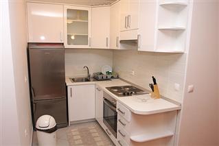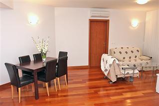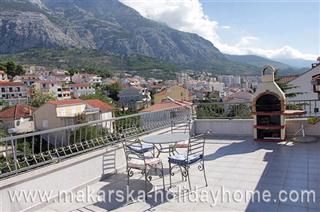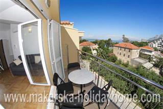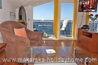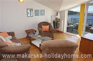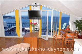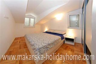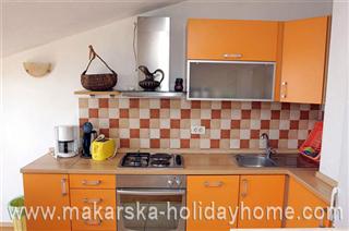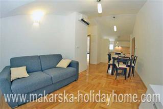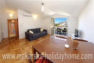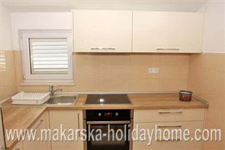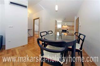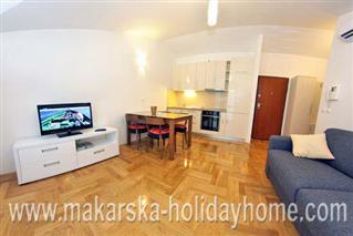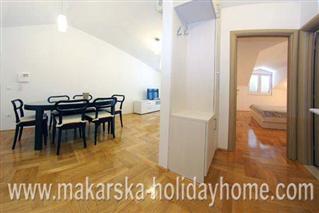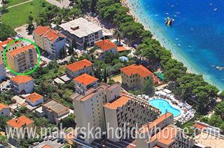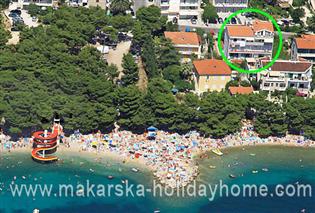 położony w centralnej części Makarskiej w pobliżu plaży i hotelu "Meteor", znajduje się zaledwie 30 metrów od plaży i centrum miasta.Mieszkanie składa się z dwóch pokoi, salon, kuchnia, jadalnia + łazienka + balkon z widokiem na morze, garaż.