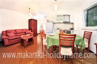 Apartmani Marela A1 / 45 m2 / 2. kat / nova lijepa moderna kuća, nalazi se u centru Makarske udaljena samo 100 m od gradske plaže. Kvalitetno opremljen apartman raspolaže s 1 dvokrevetnom spavaćom sobom + dnevnim boravkom + kuhinjom s blagovaonicom u sklopu dnevne sobe, kupaonicom i 2 balkona.