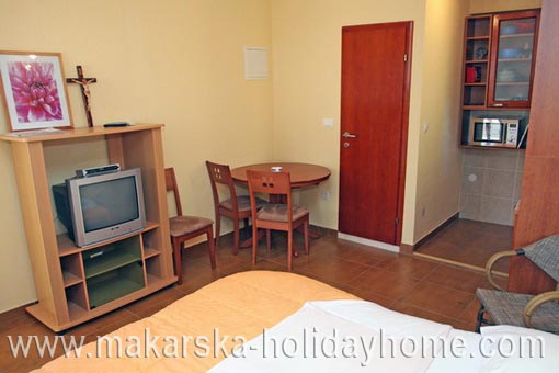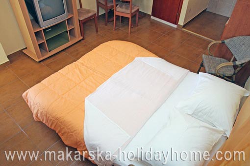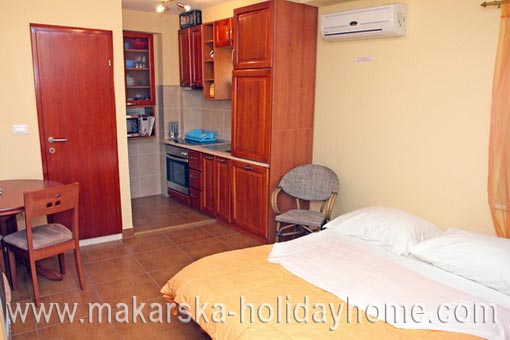 Studio Apartman KOVACIC A2 / 20 m2 / 2. kat / Nalazi se u zapadnom dijelu Makarske odmah do hotela "Biokovka", udaljen 80 m od mora i restorana, trgovina, caffe barova i zabavnih sadržaja a istovremeno pruža gostima miran odmor. Apartman se sastoji od dvokrevetne spavaće sobe + kuhinje + kupaonice / wc i balkona. Gostima je na raspolaganju vanjski bazen sa morskom vodom.